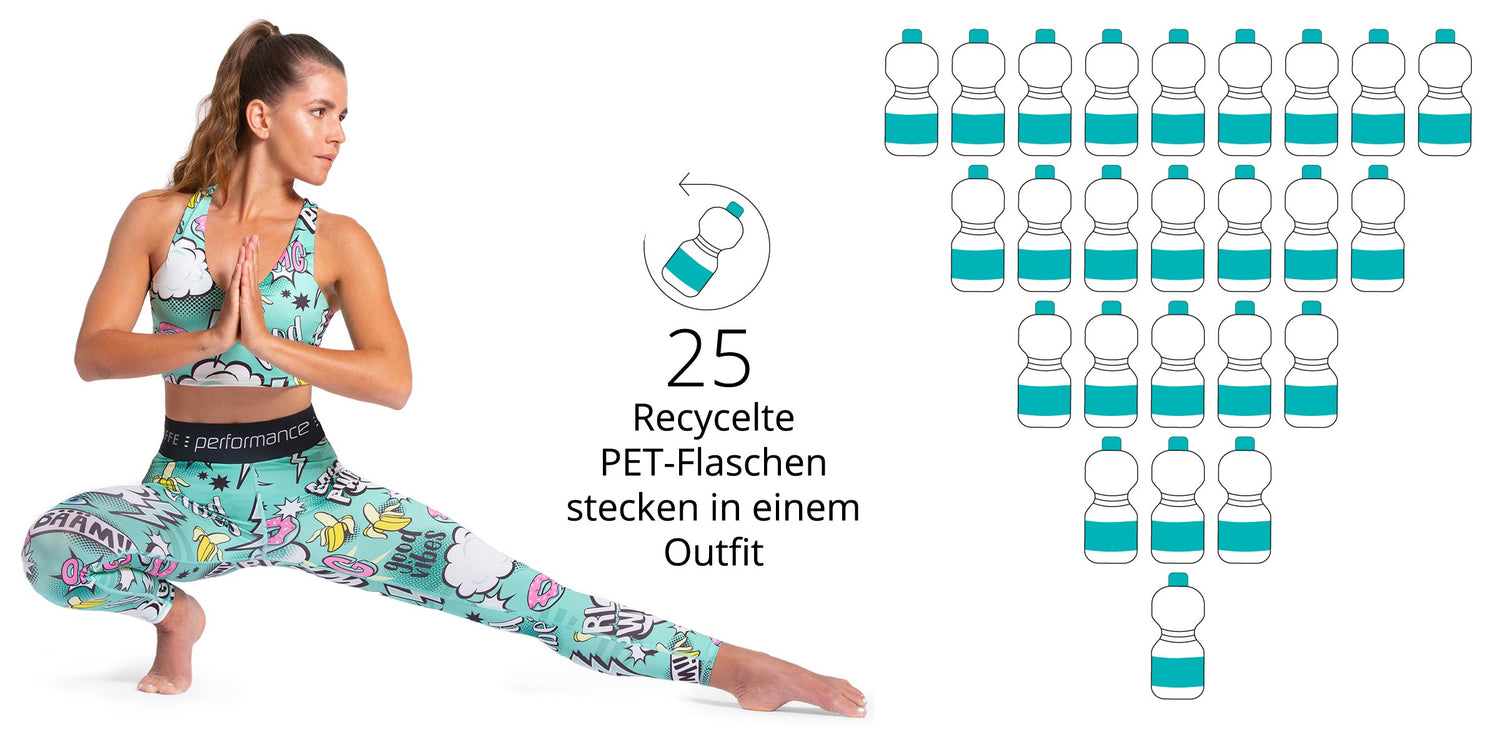 In jedem Outfit stecken 25 wiederverwertete PET-Flaschen. 40% hochwertige Microfaser Trevira Bioactive sorgen für das supersofte Tragegefühl, trockene Haut und Frische. Fest verankerte Silberionen verhindern das Wachstum von Bakterien und wirken damit der Geruchsentwicklung entgegen. Trevira Bioactive transportiert Feuchtigkeit nach außen und trocknet sofort wieder. 20% Elasthan sorgen für eine super Form und Flexibilität bei jeder Bewegung.